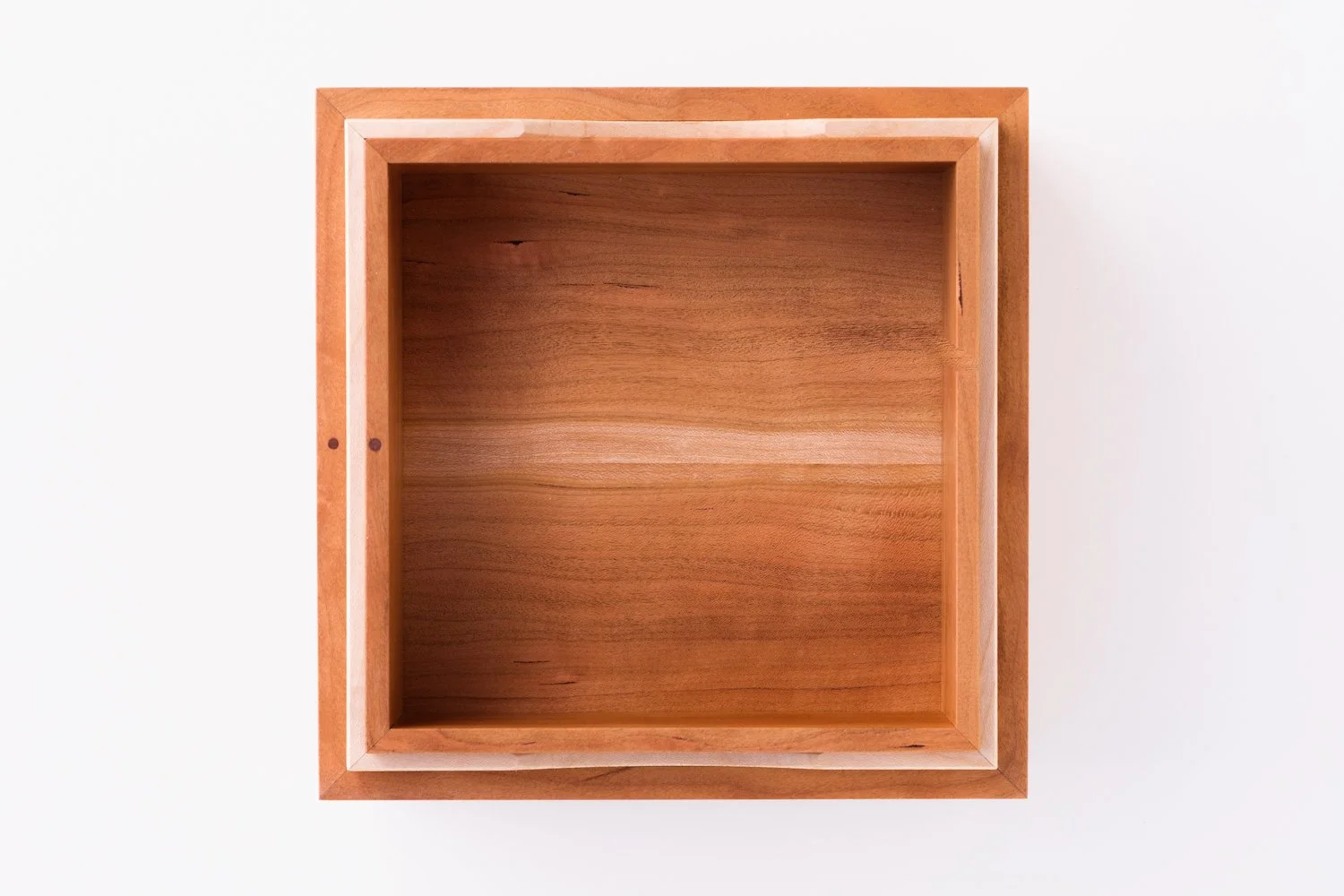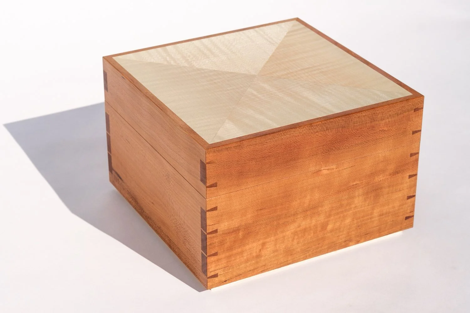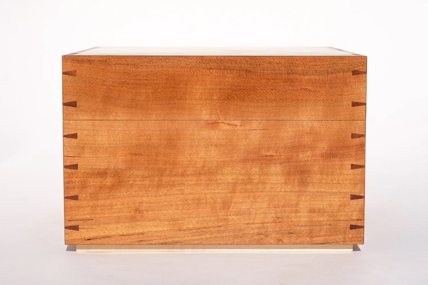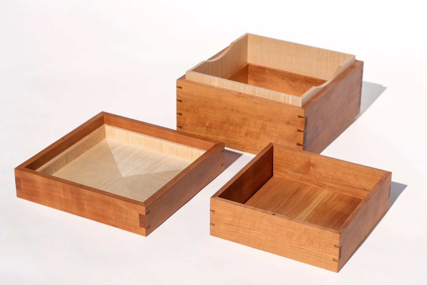 Caja de cerezo macizo, ensamblado con uniones tradicionales de colas de milano. Bandeja interior extraible.