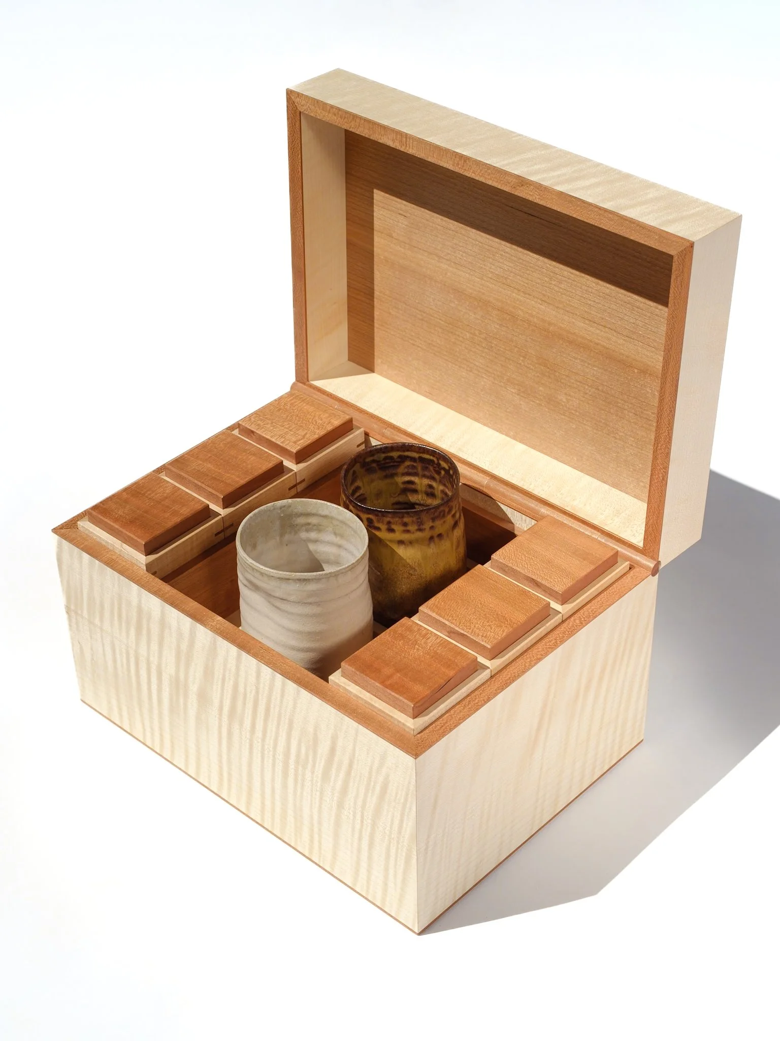 Realizada en arce rizado macizo. Bisagra hecha a mano con madera de cerezo. Diseñada para guardar diferentes tés.