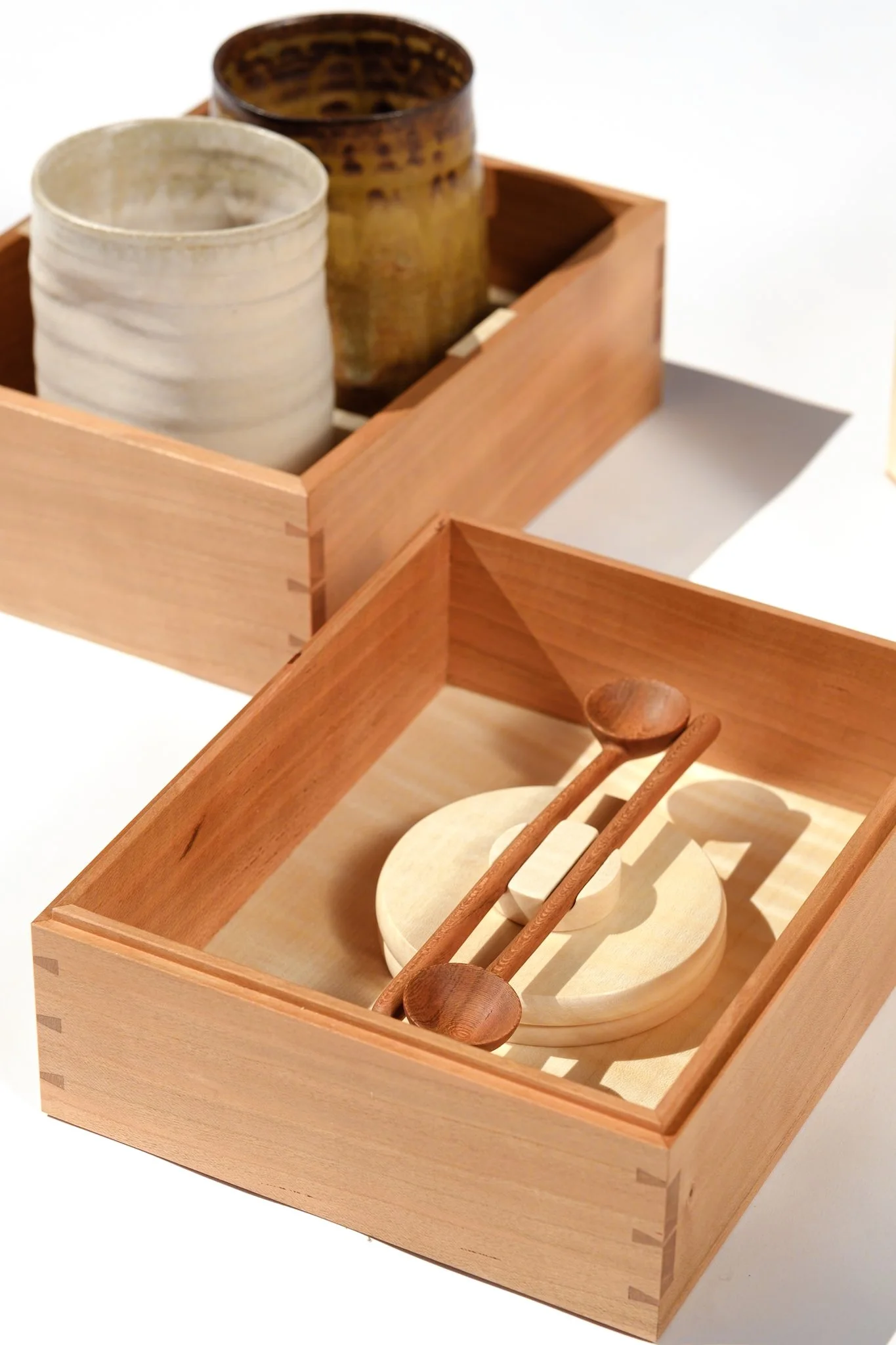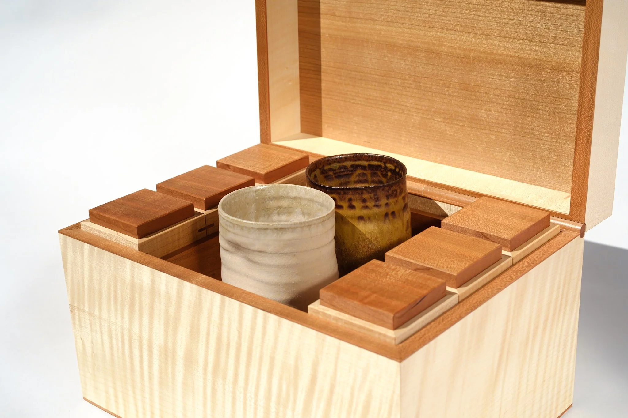 La cerámica, es una colaboración con Cerámica Micazuki. Han completado la caja con dos vasos torneados en gres, con esmaltes a partir de cenizas de encina y del propio cerezo utilizado en la caja. Todo cocido en atmósfera oxidante, a 1280 grados.